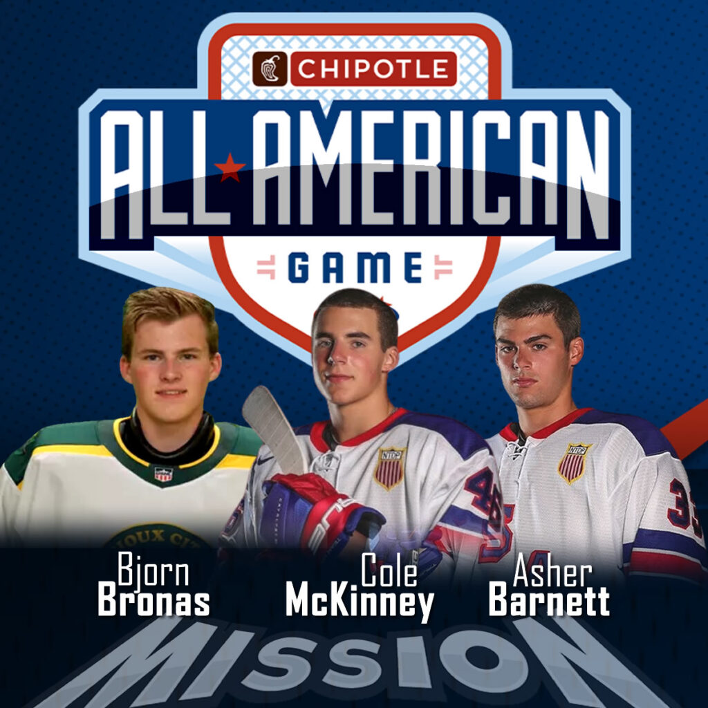Congratulations to Mission Alum Bjorn Bronas (USHL-Sioux City Musketeers), Cole McKinney (U.S. National Under-18 Team) and Asher Barnett (U.S. National Under-18 Team) on being selected to the Chipotle All-American Game.